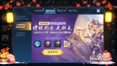 1、进入游戏,点击活动,然后再点击限时活动,有一个嫦娥的月之献礼活动,活动时候是一月十一号到一月二十七号,然后点击介入活动
