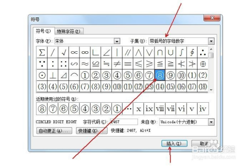 在“子集”中选择“带括号的字母数字”,并鄙人方选中带圆圈的数字8(⑧),点击“插入”。