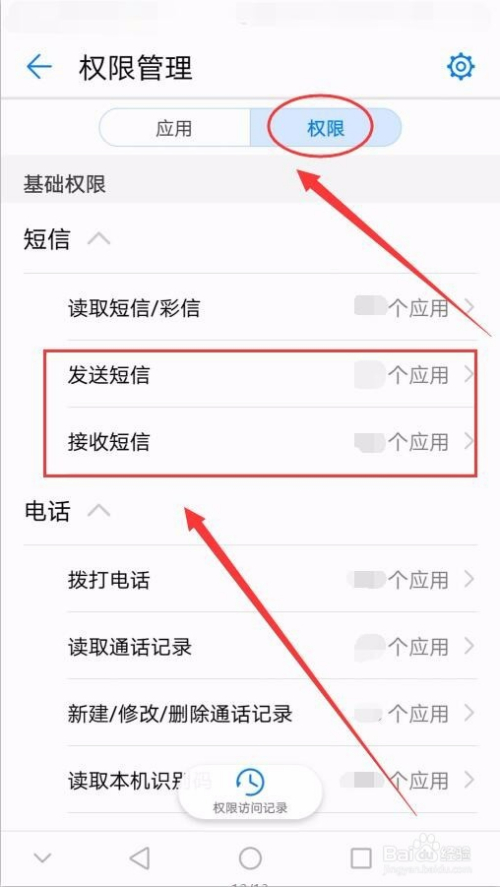 权限办理窗口中,选择权限选项卡,可以设置各应用的发送短信和接收短信权限。