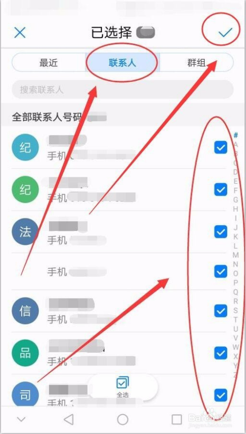 选择联系人选项卡,选中所有要群发的对象,单击右上方的勾。