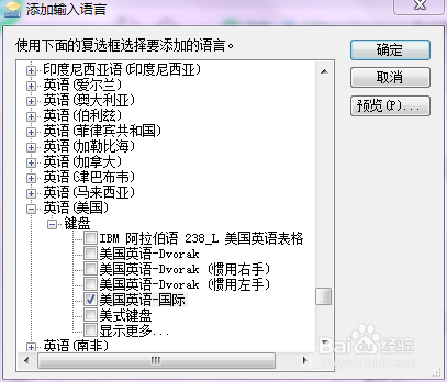 再双击英语中的英语(美国),再双击键盘,再按照本身的需要给一种打上对号,我用的是美国英语-国际。
