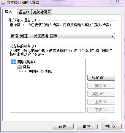 若是常用的话把默认输入法改为英语(美国)美国英语-国际,再点应用,确定。