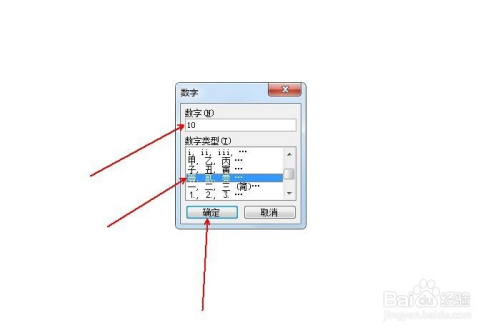 在“数字”输入框中输入阿拉伯数字“10”,并鄙人方的“数字类型”下拉列表中选中“壹, 贰, 叁…”,点击“确定”。