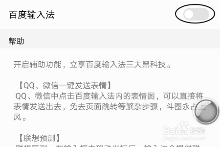 点击智能辅助今后,在“无障碍”中我们找到百度输入法,然后将输入法的辅助功能打开,如图二所示...