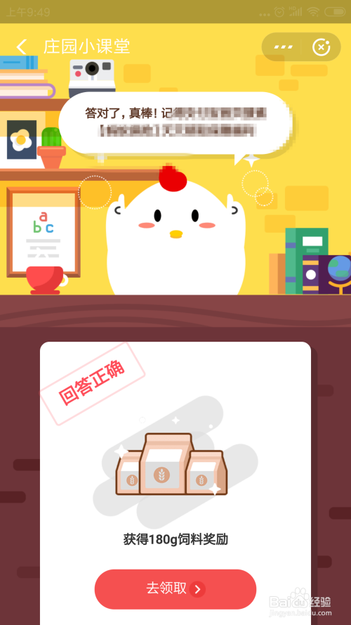 然后我们一路来看看谜底,小编答对了,可以领取一份小鸡饲料,如下图所示哦,你们也快来尝尝吧。