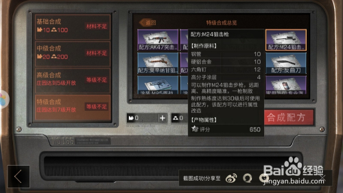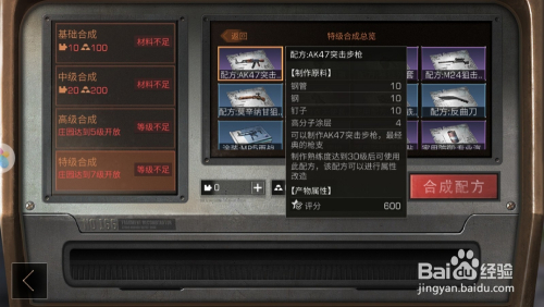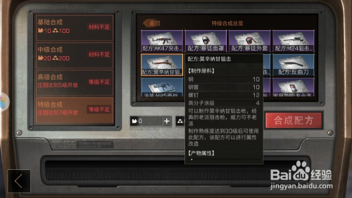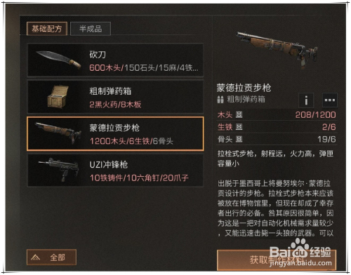 低等兵器本家儿要有蒙德拉贡步枪和UZI冲锋枪。在家园中,点击装备建造台——兵器装备,只要材料足够,就可以在此中建造兵器了。