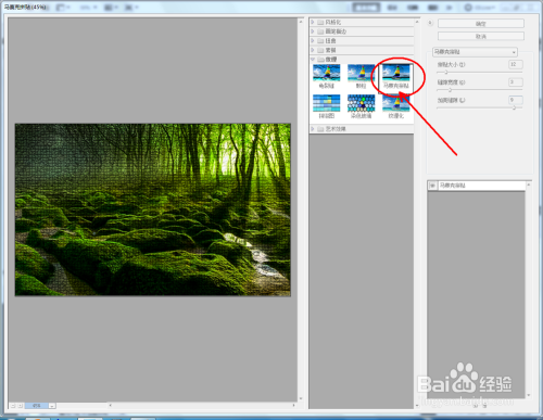 点击【滤镜】-【纹理】-【马赛克拼贴】,弹出马赛克拼贴设置框,按图示对马赛克拼贴的拼贴大小、裂痕宽度、加亮裂缝的参数进行设置(如图所示);