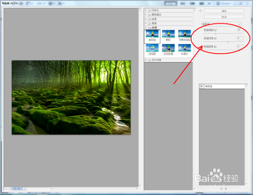 点击【滤镜】-【纹理】-【龟裂痕】,弹出龟裂痕设置框,按图示对龟裂痕的裂痕间隙、裂痕深度、裂痕亮度的参数进行设置(如图所示);