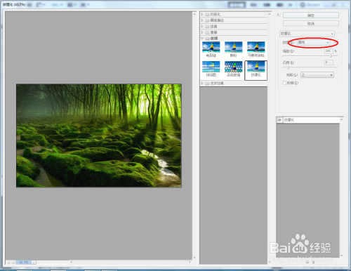 点击【滤镜】-【纹理】-【纹理化】,弹出纹理化设置框,按图示对纹理化的缩放、凸现的参数进行设置(如图所示);