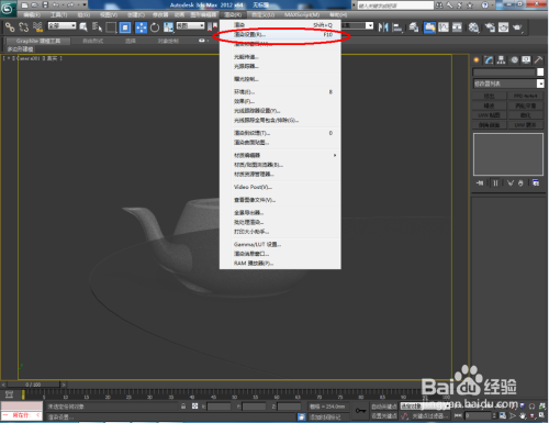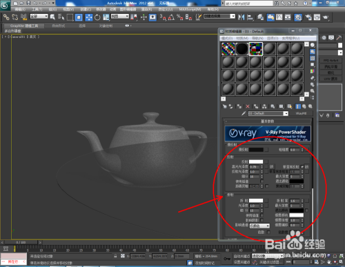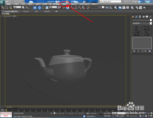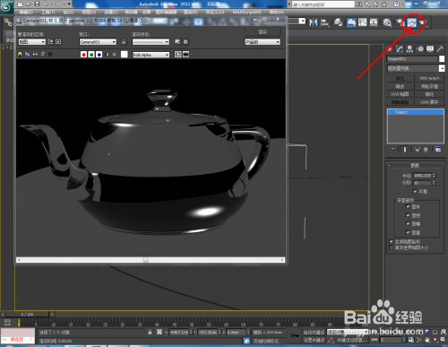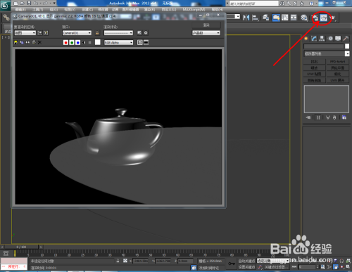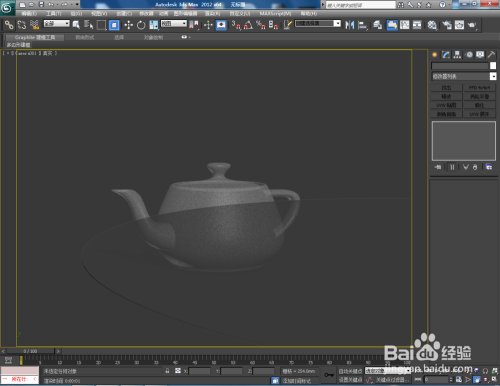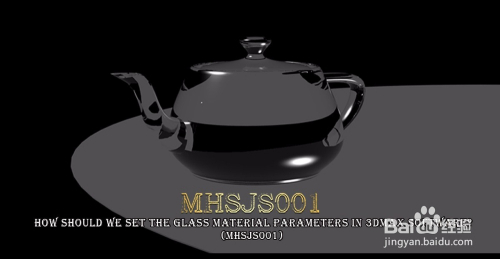 绘制一个圆形桌面模子,点击【材质编纂器】设置一个深灰色桌面材质球并附加给桌面模子。点击【衬着】,将玻璃茶壶衬着出图(如图所示);