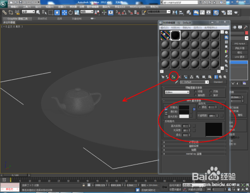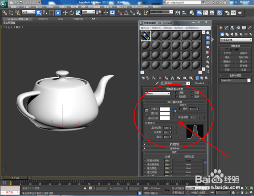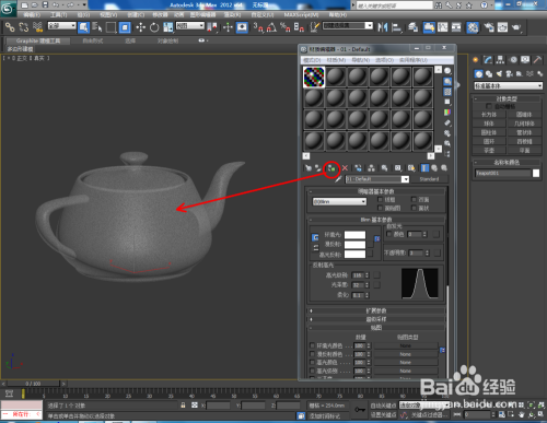 点击【材质编纂器】,弹出材质编纂器设置框。按图示参数设置一个玻璃材质球,反射参数设置为:30并将材质球附加给模子(如图所示);