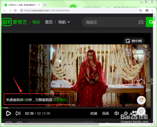 在爱奇艺网站中播放一部你想看的VIP片子或电视剧。从屏幕左下角的文字提醒可以看到,非VIP会员只能免费看6分钟。