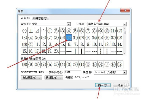 在“子集”中选择“带括号的字母数字”,并鄙人方选中带括号的数字⑽,点击“插入”。