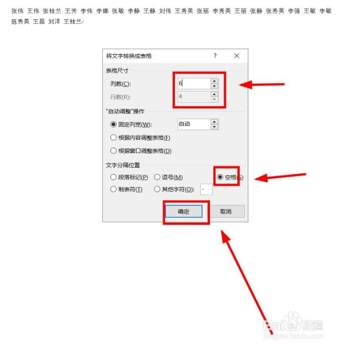 呈现将文字转换当作表格对对话框,将列数处该为本身所需要的列数,将文字分隔位置处选择“空格”,完当作后单击“确定”