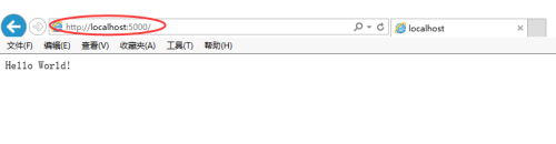 我们打开浏览器,输入地址http://localhost:5000,若是一切正常的话,可以看到页面输出Hello World,如下图所示: