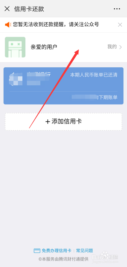 在微信7.0信用卡还条目界面里,直接点击【亲爱的用户 我的】,如下图所示。