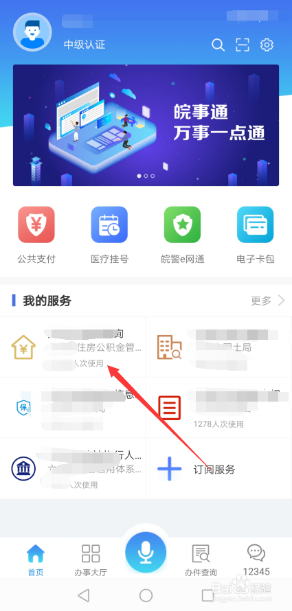 注重:要查询公积金,皖事通账号必需是已经进行中级以上认证了。