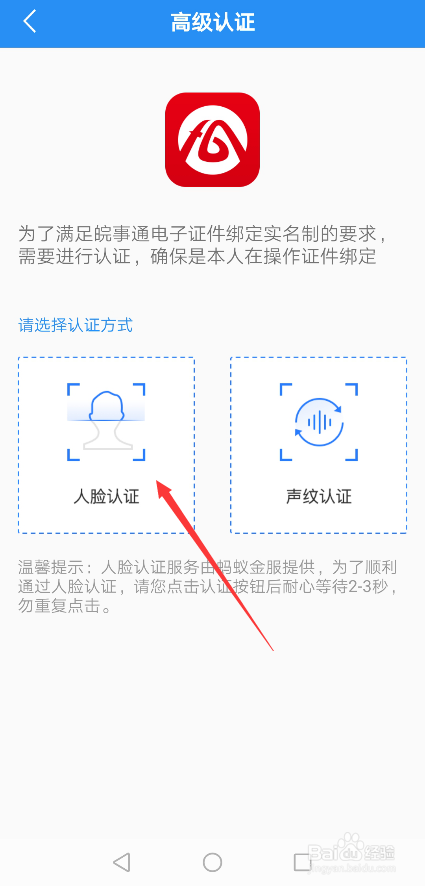 在高级认证界面里,将本身的脸部放到圆圈里进行认证识别,如下图所示。