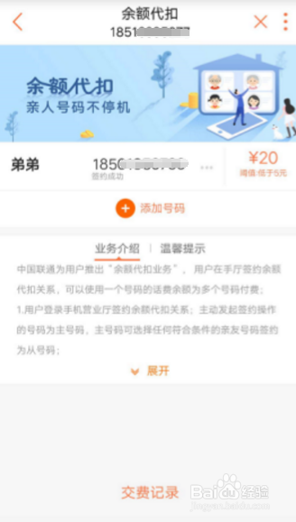 3、进入余额代扣页面,登岸号码即为本家儿号码,查询展示当前已签约当作功的号码,点击【添加号码】,弹出从号码签约页面;
