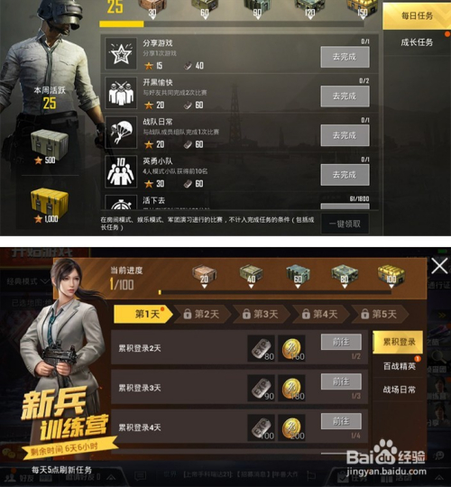 每日使命可以分享游戏,与老友完当作2次角逐等可以获得金币和宝箱,当作长使命是品级晋升可获得金币,新兵练习营累积登录,百战精英,日常可获得经验,金币
