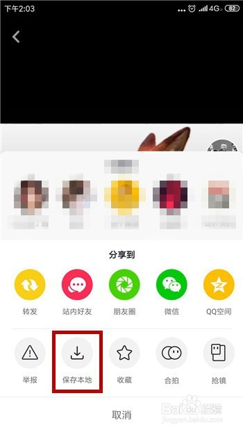打开转发界面后找到【保留当地】并点击把视频保留到手机里。