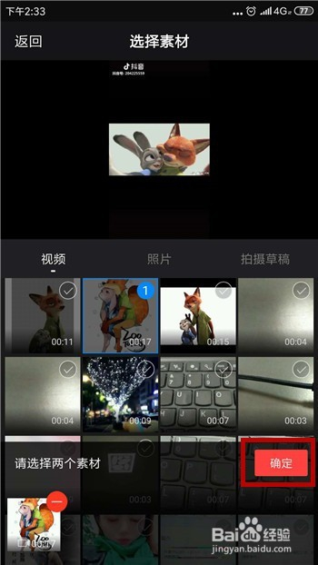 添加视频的时辰第一个选择狐狸与兔子的视频,第二个选择我们本身的视频,然后点击【确定】。
