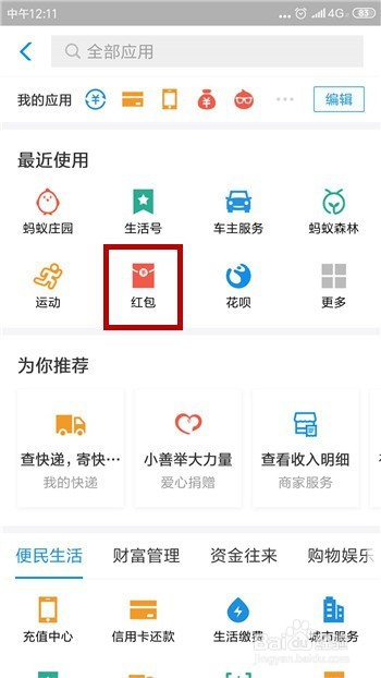 点击后会打开应用界面,找到并点击最新利用下方的【红包】应用。