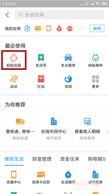 在付出宝的应用界面里找到上方的比来利用,然后找到此中的【蚂蚁庄园】并点击打开。