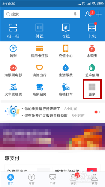 打开了付出宝后在首页顶部找到【更多】选项并点击。