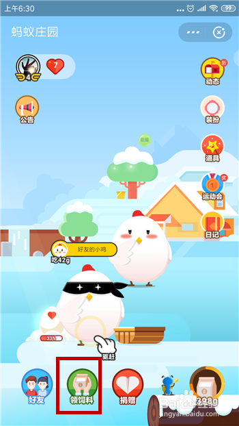 然后在蚂蚁庄园应用里找到底部的【领饲料】使命并点击。