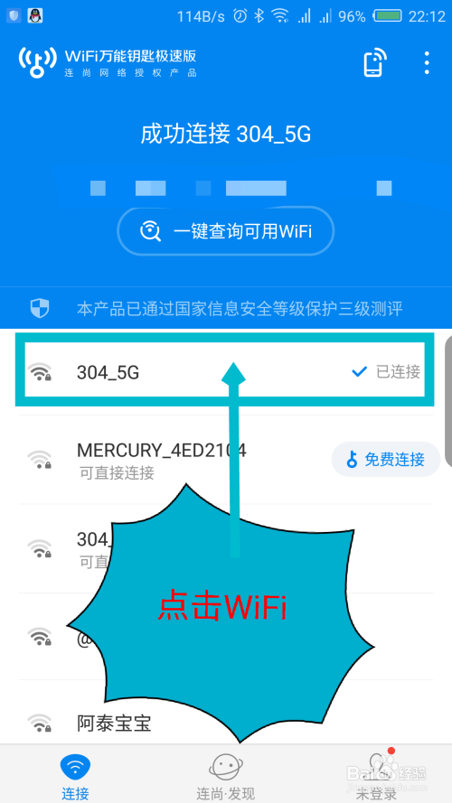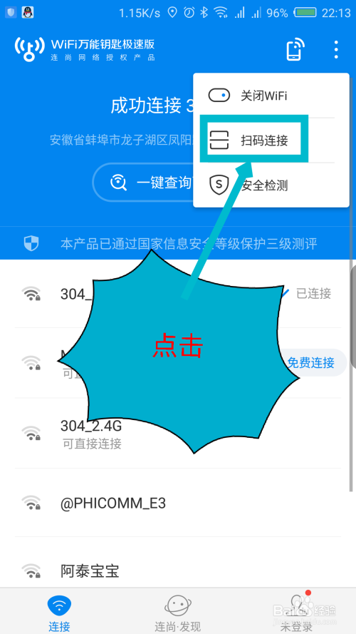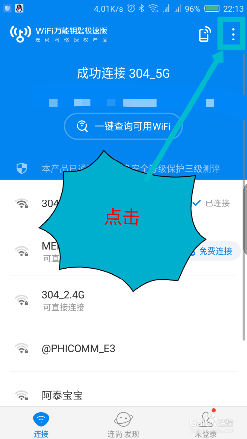 在打开的全能钥匙的毗连界面,选摘要分享的当前WiFi,点击一下。如图所示