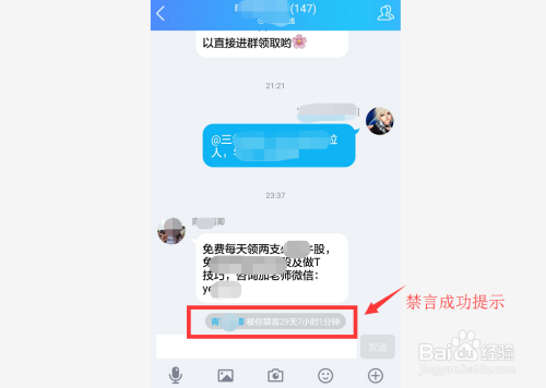 返回到群动静中,我们能看见设置禁言当作功提醒,接下来就可以顺带撤回其所发信息了。