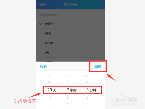 进入到禁言时长中,可以选择系统默认的禁言时候也可以自界说禁言时长,下面我们选择自界说时长。