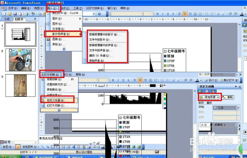 最后就是要懂得插入一些影片和声音,以及设置动画。点击插入——影片和声音,按要求去选择一种影片或声音。设置动画的方式,先选摘要设置动画的对象——点击幻灯片放映——自界说动画——添加结果,然后设置一种本身喜好的动画类型就可以了。