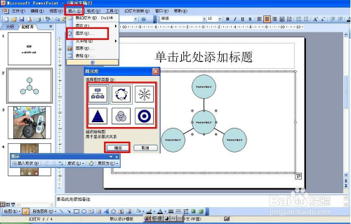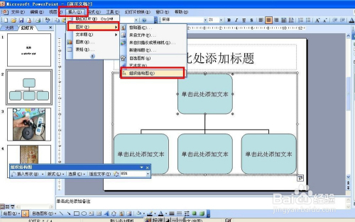 若是要课件建造过程中需要建造一些隶属关系的布局图,可以点击插入——图片——组织布局图,如许就可以插入隶属关系的组织布局图了。