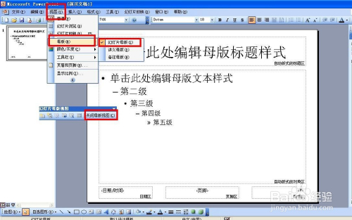 幻灯片母版的设计。有时我们每个幻灯片都要利用同一的题目和文字样式,可以经由过程母版的体例来建造,点击视图——母版——幻灯片母版(也可以选择其它母版)——然后设置题目样式和文本样式,也可以同一设置布景——完当作后点击封闭母版。
