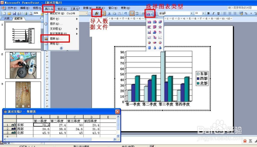 若是有一些数据标的目的大师申明,同时也要把数据建造当作图表,点击:插入——图表,就会插入图表。若是有EXCEL表格数据,可以点击导入文件,然后导入数据。还可以选择图表的类型。