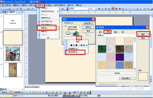 给幻灯片设置纹理或者图片布景:点击格局——布景——点击下拉箭头,选择填充结果——点击纹理,然后选择一种纹理,点击确定(也可以选择渐变、图案或图片)