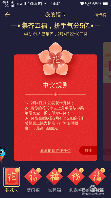 中奖体例,就是在2月4日21:30开奖,一共有2019份。若是你花花卡左上角的号码与开奖的号码一致,恭喜你中年夜奖了!!!如下图所示: