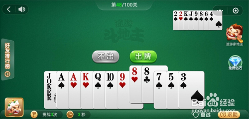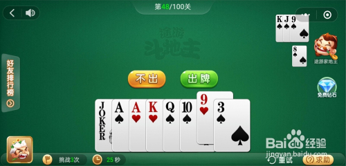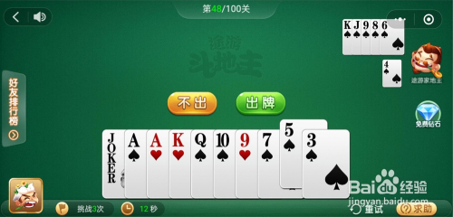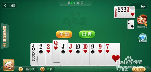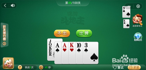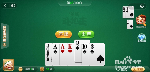 电脑打出一张K,我打出一张小王,接着打出一对A一张K一张10一张3就过关了。