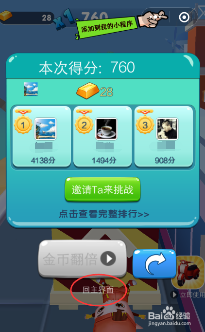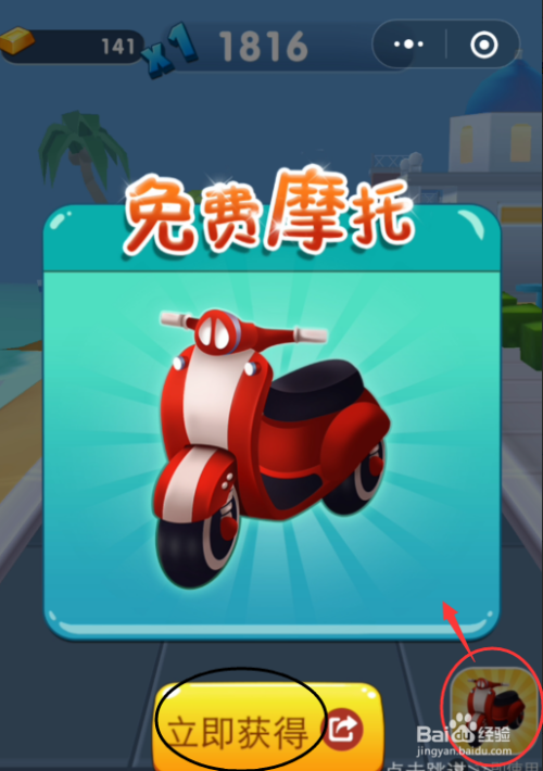 第一次碰着障碍物,会掉去摩托车,若是需要【免费摩托】,点击“当即获得”,会呈现需要分享聊天东西,才可以继续角逐。