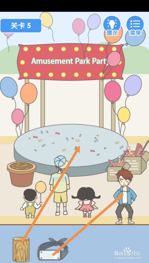 获得护额后,将护额拖动到男本家儿身上,然后将木桩拖动到舞台上。最后点击男本家儿就过关了。
