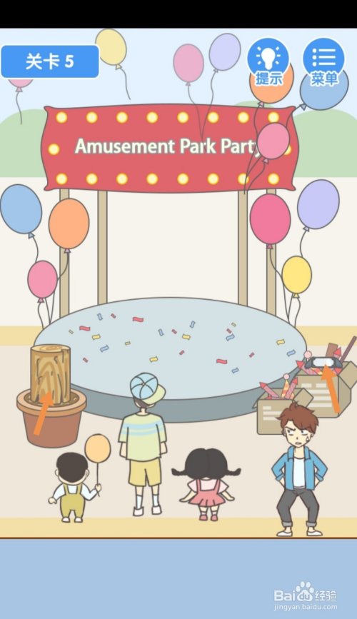 在左边,将两个气球拖动到小猫咪身上,然后点击男本家儿就过关了。