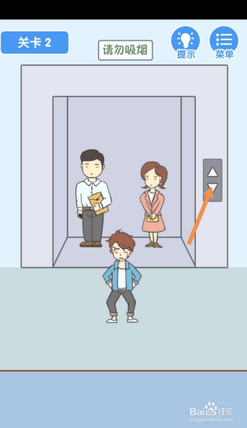 第2关先点击电梯上下箭头,电梯门关上后,点击男本家儿就过关了。