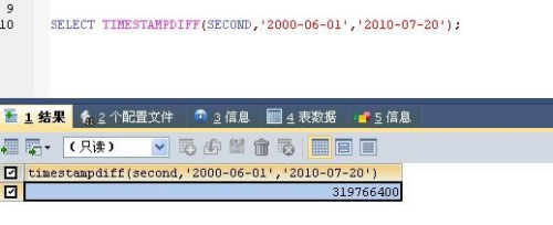 SELECT TIMESTAMPDIFF(SECOND,'2000-06-01','2010-07-20');返回319766400