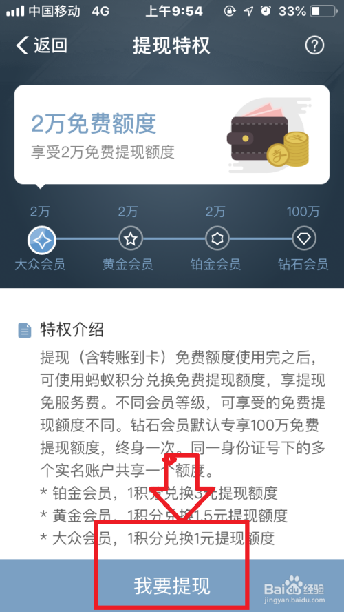 - 进入“付出宝会员”页面,点击“提现特权”——“我要提现”,即可查看“残剩免费额度”。