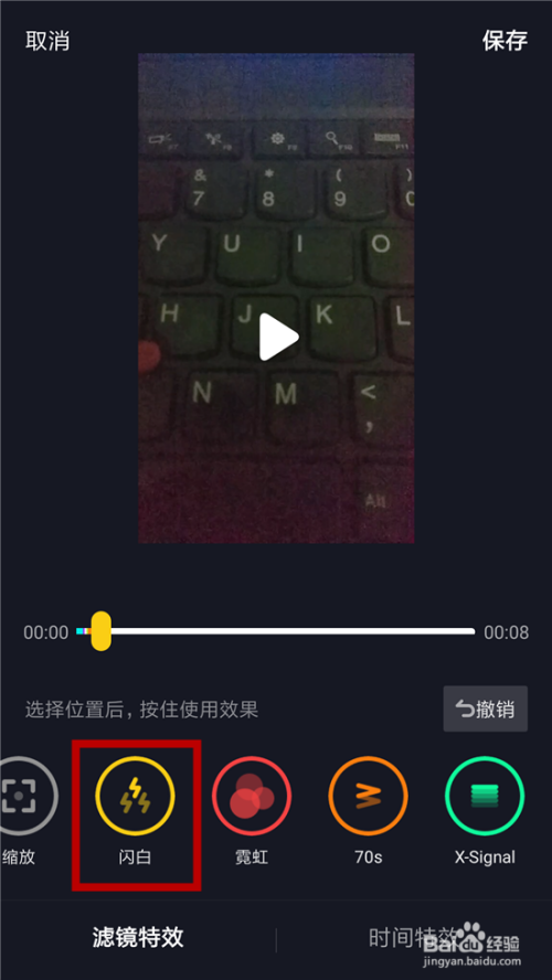 利用的时辰需要按住这个特效,然后视频会呈现白色闪屏的结果,利用好后点击右上角的【保留】。