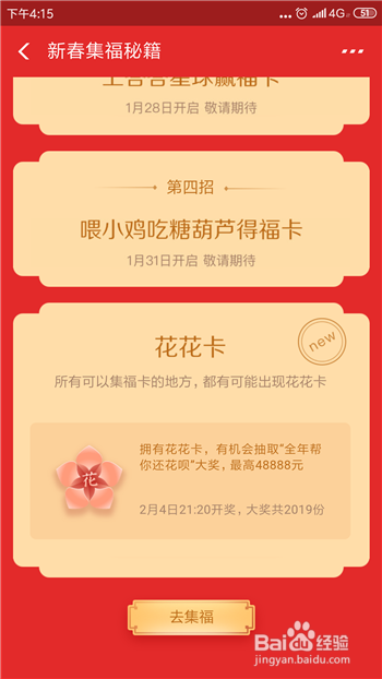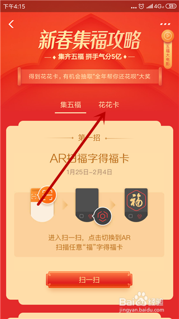 在五福活动中点击【攻略】去查看下花花卡的获得方式。