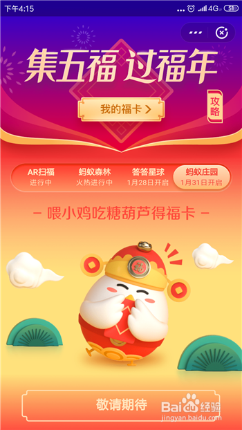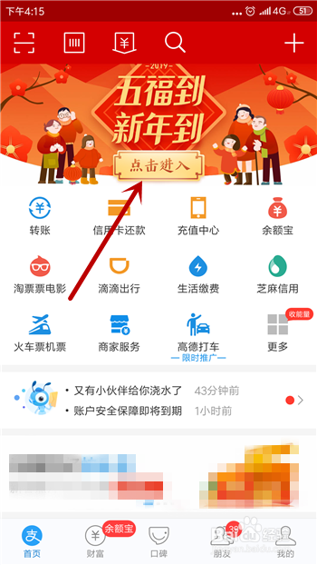 想要获得花花卡可以先在集五福中看看花花卡到底是什么以及有什么用,在付出宝里点击进入集五福活动。