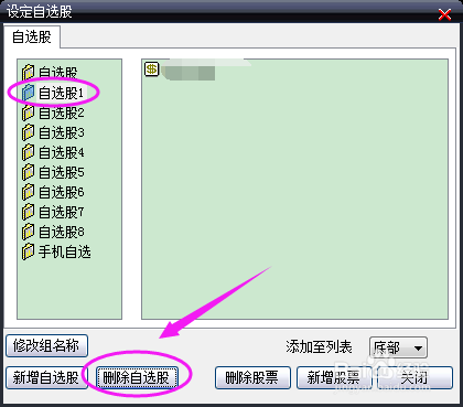 点击选项的(自选股办理),弹出如图所示界面,再选择(自选股1)后点击下方的(删除自选股)即可整体删除自选股1、自选股2。
